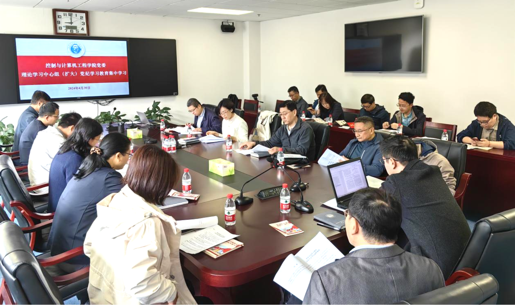 4月30日,永利3544am登录官网党委开展党纪学习教育集中学习暨党委理论学习中心组(扩大)学习。学院领导班子成员、党委委员、教工党支部书记、教研室主任参加学习,会议由党委书记王韶华主持。